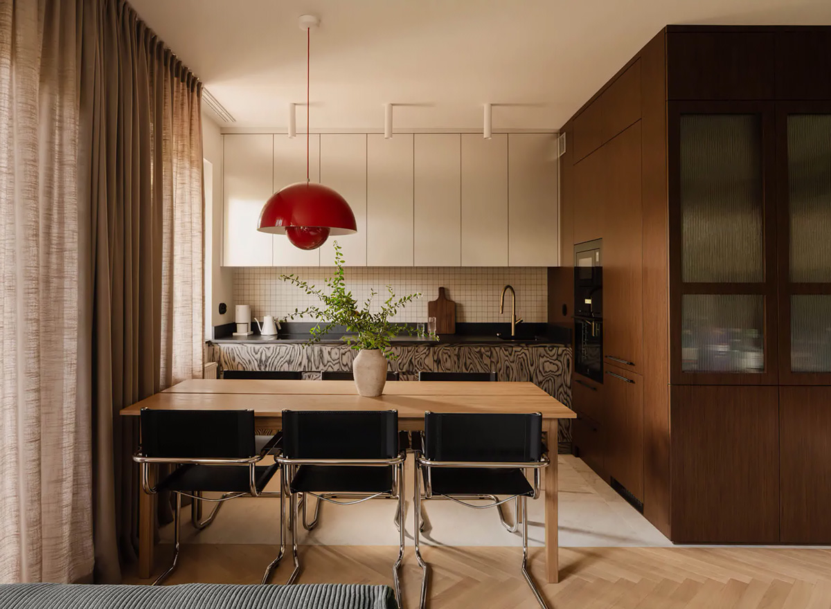 Эта квартира в тихом спальном районе в Варшаве был спроектирована Matuszewski Studio для холостяка, который ценит спокойствие домашнего очага и любит окружать себя объектами со смыслом. Поэтому интерьер его квартиры не должен был впечатлять смелыми и слишком экпрессивным декором, а скорее создавать для своего хозяина расслабляющую атммосферу, в которой можно наслаждаться повседневными ритуалами и отдыхать от ритма города. Этому отлично способствует атмосферная цветовая гамма, состоящая из тёплых землистных оттенков, включая детали из натурального дерева. Стильно и уютно!
