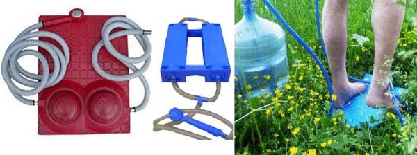 Начнем с самых простых моделей, которые даже устройства кабинки или большой емкости не требуют. Есть мобильные души, которые работают по принципу ножного насоса. Источником воды является любая емкость, которую ставите рядом с собой — ведро, тазик, бак — что есть. В нее опускаете конец шланга, подключенный к ножному насосу, который чаще всего выглядит как коврик.