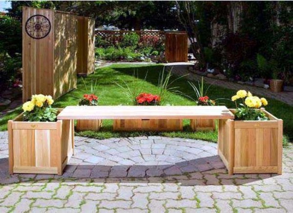 Если у кого-то есть крупные растения в прочных вазонах, можно реализовать следующую идею. В этом варианте скамейка охватывает растения. Чтобы не было неожиданностей, вазоны должны быть очень прочными….