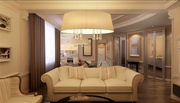 Разрабатывая дизайн квартиры, не забывайте об освещении. В центре помещения устанавливают массивную люстру с большим количеством подвесок. Чаще всего из хрусталя. Остальное освещение может быть периферийным потолочным (встроенные светильники), сделано при помощи бра и других настенных светильников.