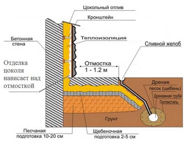 Лучше всего отделывать цоколь после того, как сделана отмостка вокруг дома. В этом случае отделочный материал будет нависать над дорожкой. В результате, даже самый косой дождь или стекающие по стенам потоки воды не смогут попасть между стеной и отмосткой — вода попадает на дорожку на расстоянии нескольких сантиметров от места стыка. А именно через этот стык и проникает вода к фундаменту, принося сырость и другие проблемы.