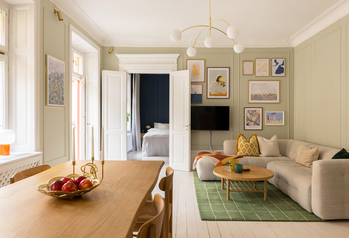 Благодаря пастельным стенам и ярким постерам в открытой гостиной этой небольшой двухкомнатной квартиры в Стокгольме царит свежая и даже летняя атмосфера. Кроме этого зеленый ковёр, светлый (почти белый) пол и деревянная мебель добавляют приятные нотки загородной жизни в интерьер. А вот спальня получилась наоборот — элегантной и немножко драматичной из-за красивого глубокого синего оттенка стен и гардероба с фасадами под мрамор. Вот такой замечательный городской интерьер с контрастными комнатами!