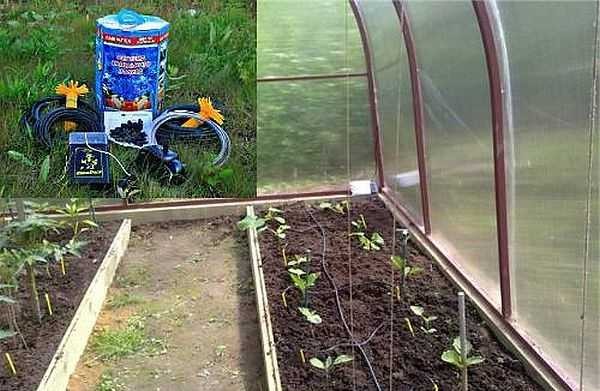 В комплекте поставляется фильтр для тонкой очистки воды, если загрязнений много, предварительно поставьте гравийный. Способ сборки капельной системы полива стандартный: от крана в нижней части емкости монтируется подающий трубопровод из шланга внутренним диаметром 15 мм (в комплекте нет). Доведя до грядок, шланг разрезаете, вставляете тройник (идет в комплекте), к свободному выходу подсоединяете ленту нужной длины. С другой стороны тройника устанавливается кусок трубы того же диаметра. Его длина — до следующей ленты. Так собираете всю схему, в последней линии полива используется не тройник, а уголок (есть в комплекте).