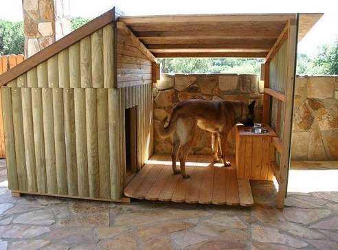 Вообще, если есть возможность, собаки предпочитают проводить время на улице. Потому неплохо было бы сделать перед собачьей будкой или сбоку от нее навес. А чтобы была возможность под ним сидеть/лежать — сделать настил.