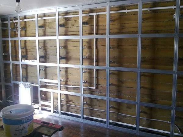 • На каркас из оцинкованных профилей. Позволяет получить идеальную поверхность при любой кривизне. Профили крепятся на специальные фиксаторы. Из них собирается каркас — стойки и перемычки — лицевая часть которых лежит в одной плоскости. Так как гипсокартон находится от основной стены на приличном расстоянии, между ним и стеной можно уложить коммуникации и электропроводку. Еще один плюс этого варианта — возможность укладки утеплителя или звукоизоляции. Минус каркаса из профиля — без утеплителя он очень хорошо проводит звуки: если ударить по обшивке стены, звук получается, как по барабану.
