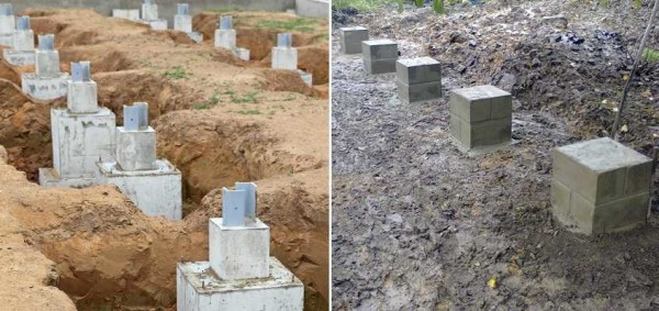 В грунтах хорошо отводящих воду столбчатый фундамент делают мелкого заложения или незаглубленный. Тут важно только правильно подобрать площадь колонн, чтобы равномерно передавать нагрузку.