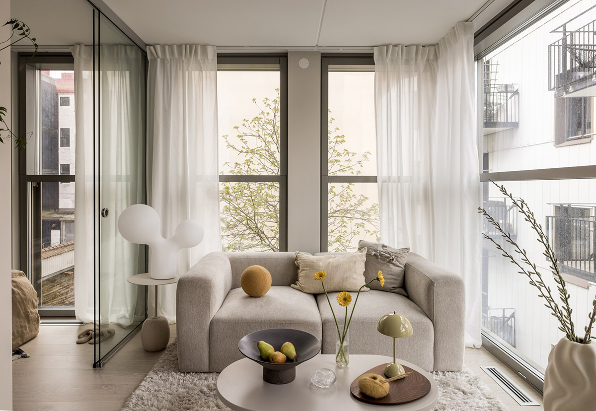 В этой маленькой шведской двушке не просто большие окна — по сути, все внешние стены здесь из стекла. Так как это центральный район, соседние дома стоят здесь совсем близко, поэтому в интерьере есть ощущение жизни «у всех на виду». Оформление интерьеров идеально соответствует современной архитектуре дома — оно строгое современное, но стильное, в нейтральных тонах и с минимальным количеством декора. А вы бы смогли так жить?:)
